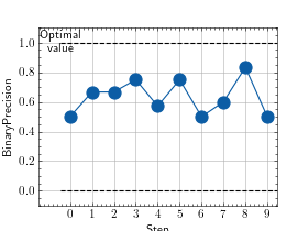 >>> from torch import rand, randint >>> # Example plotting multiple values >>> from torchmetrics.classification import BinaryPrecision >>> metric = BinaryPrecision() >>> values = [ ] >>> for _ in range(10): ... values.append(metric(rand(10), randint(2,(10,)))) >>> fig_, ax_ = metric.plot(values)