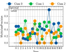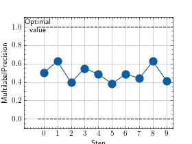 >>> from torch import rand, randint >>> # Example plotting multiple values >>> from torchmetrics.classification import MultilabelPrecision >>> metric = MultilabelPrecision(num_labels=3) >>> values = [ ] >>> for _ in range(10): ... values.append(metric(randint(2, (20, 3)), randint(2, (20, 3)))) >>> fig_, ax_ = metric.plot(values)